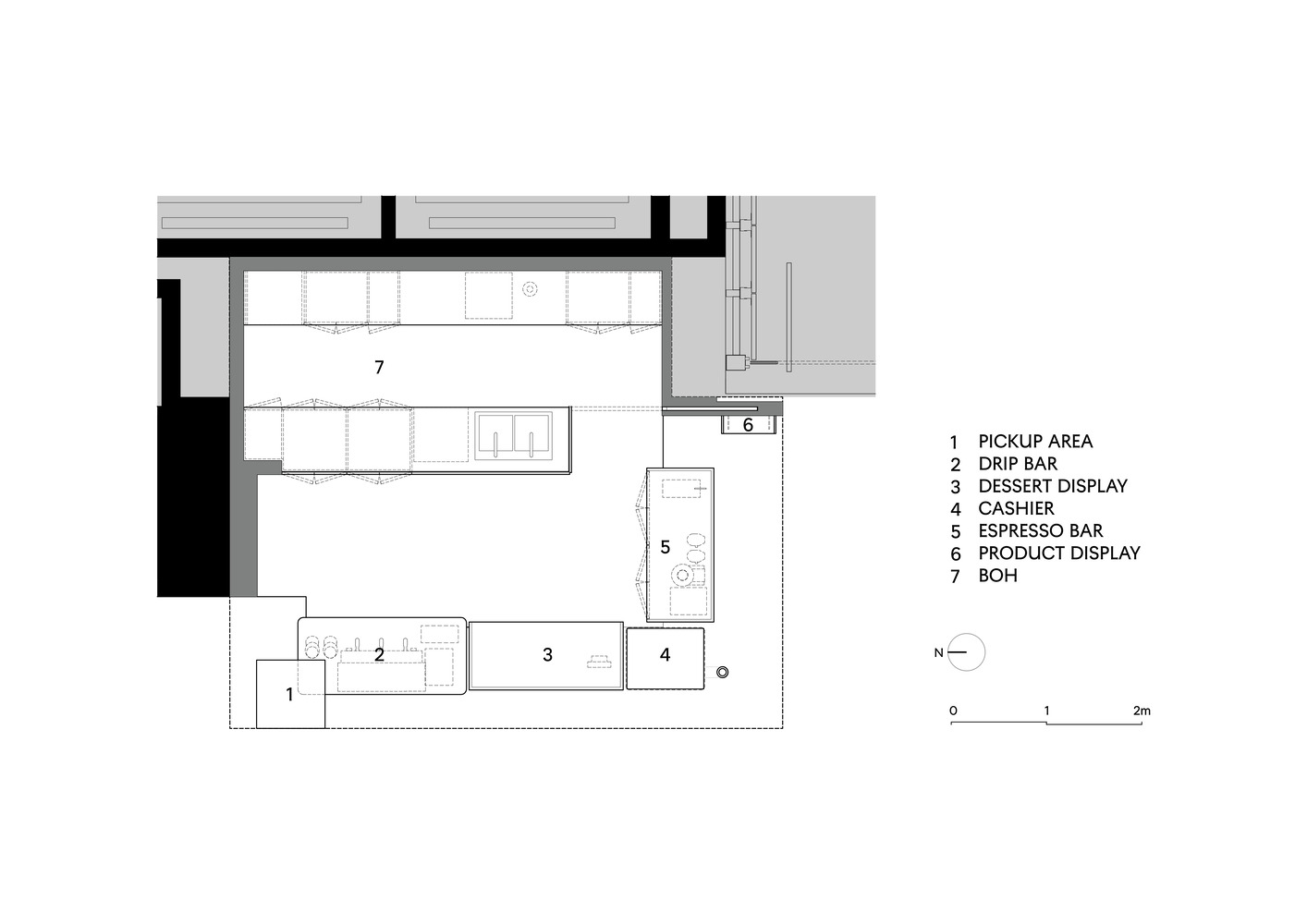 达成高效与品牌理念的完美融合。茶饮吧台被进一步细分为前区和后区两个部分,旨在确保茶饮制作区域既优雅又整洁的同时,实现专业的高效运作。在这两个部分之间,si设计团队从传统中式窗棂中汲取灵感,打造了一种既能提供私密又保持通透的隔断。这个格状的木制隔断初看普通,但细看可以发现由品牌字母“L”所构成的图案,增添了丰富性和微妙性。并且在后区的背墙,安装了与窗棂相配合的灯箱元素,暖黄色的灯光为茶饮师提供了柔和的照明,也映出了茶饮师忙碌的身影。