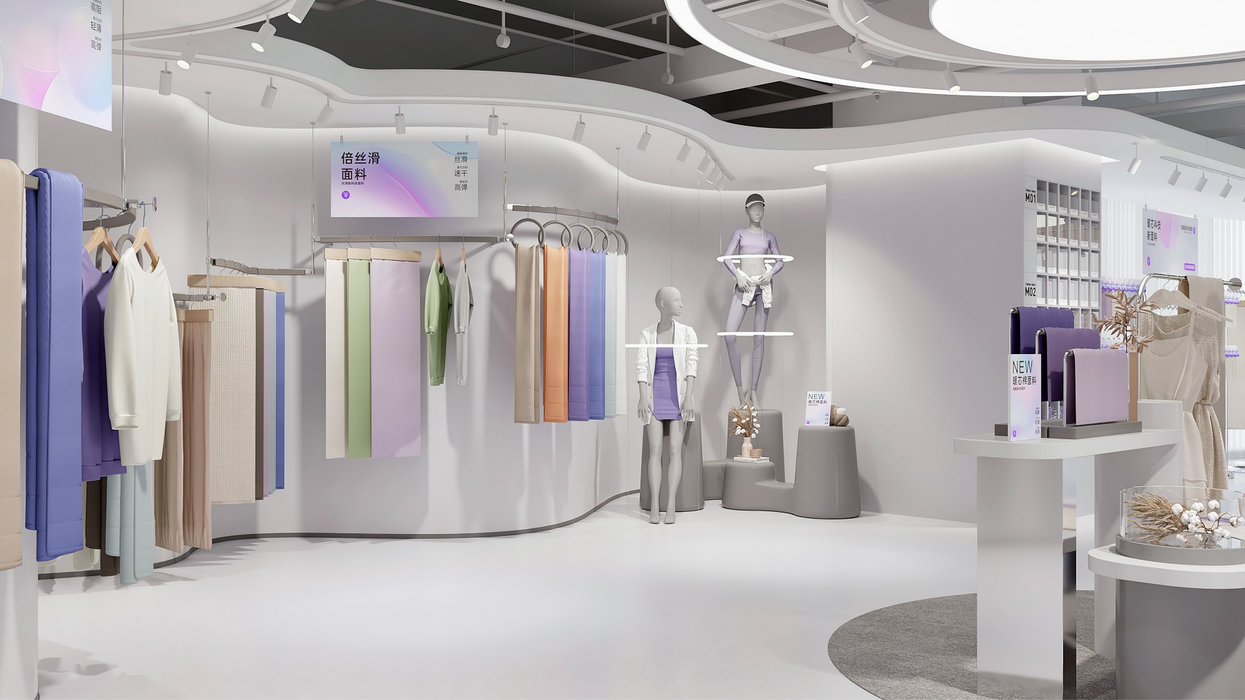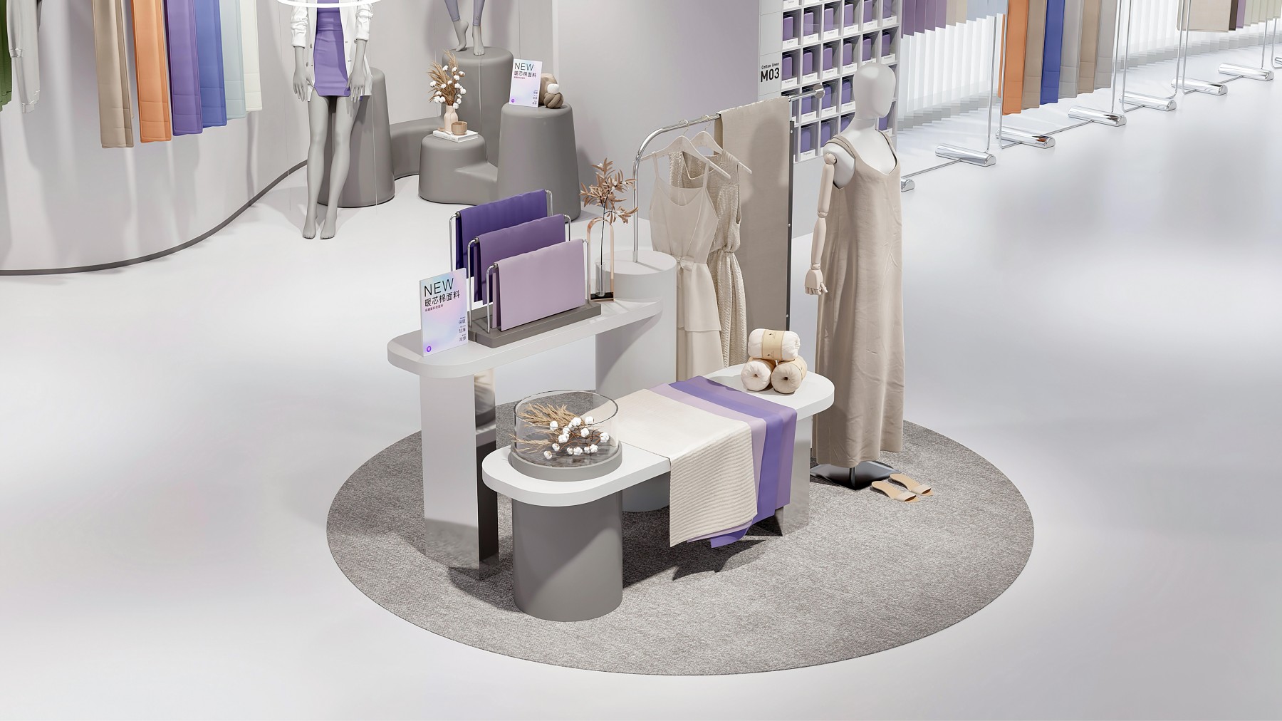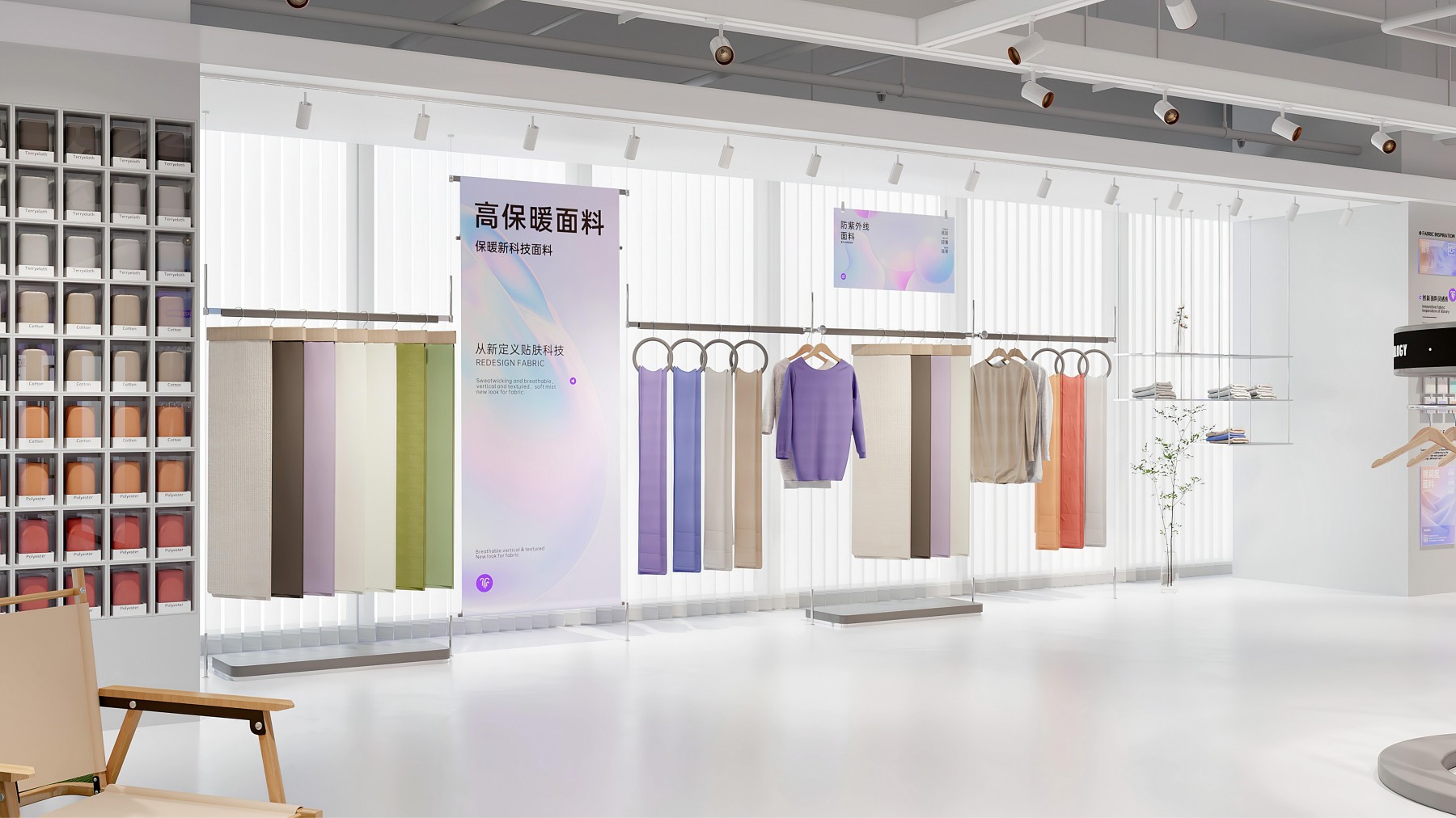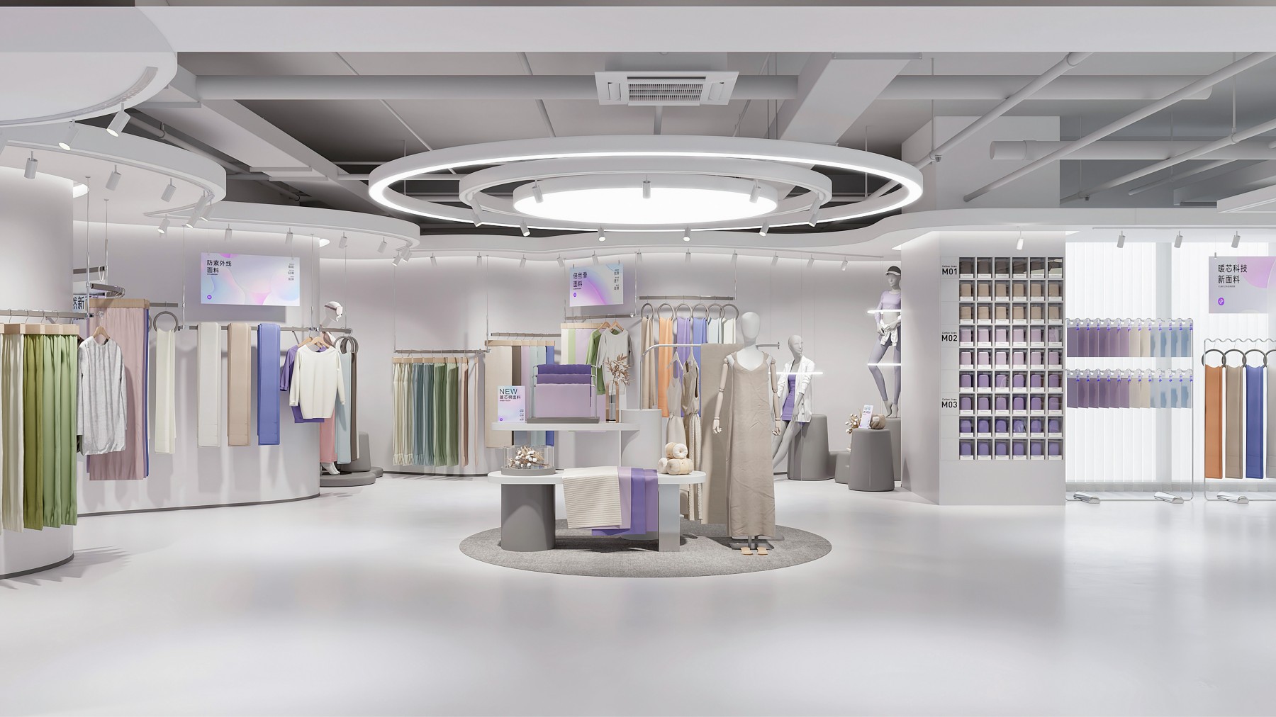主题展区中包括概念展区、流行趋势展区、活动区,面料展示方式是大布+大量样衣,结合终端环境门面采用清新的形象作为对环境和原形象的区隔;消费人群年龄段的下探,也需要更符合现时青中年更能接受的调性风格,材料应用上考虑的是各线城市都能施工的真石漆工艺,即能保证形象又能保证防水、防污、耐用。店内主体米白色、低饱和度色系,地面浅色木纹,水磨石纹砖搭配作为识别,细节上体现匠心和精致。